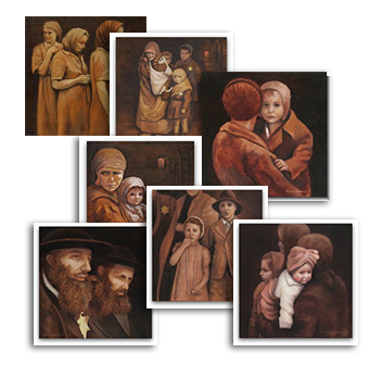 Even after being diagnosed with cancer herself, and enduring three years of chemotherapy, Pat continued to paint. She painted a woman holding a sack of challah bread on the train ramp, a grandmother standing in line for extermination with her grandchildren, an elderly man walking in solitude to the gas chamber, and two rabbis standing together in stunned silence.